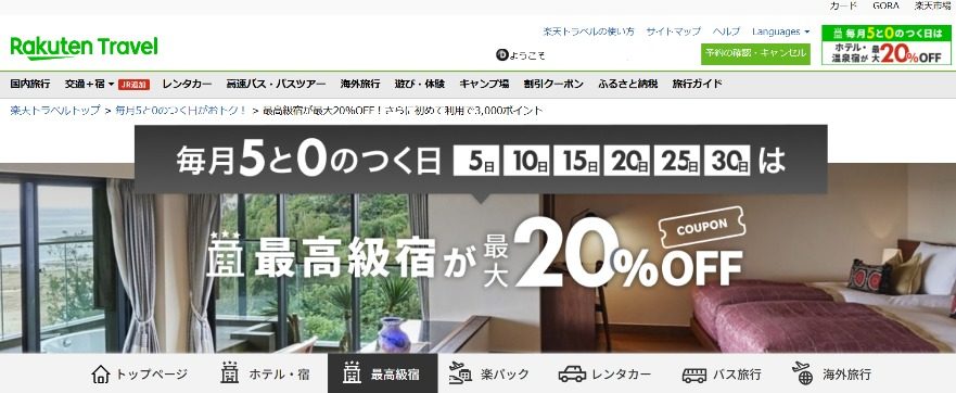 楽天トラベルはいろいろなセールを頻繁に行っています。とくに「5と0のつく日」のセールでの予約がお得と思います。さまざまなクーポンがありますが最高級宿の20%OFFクーポンが使えるとお得感が増します。