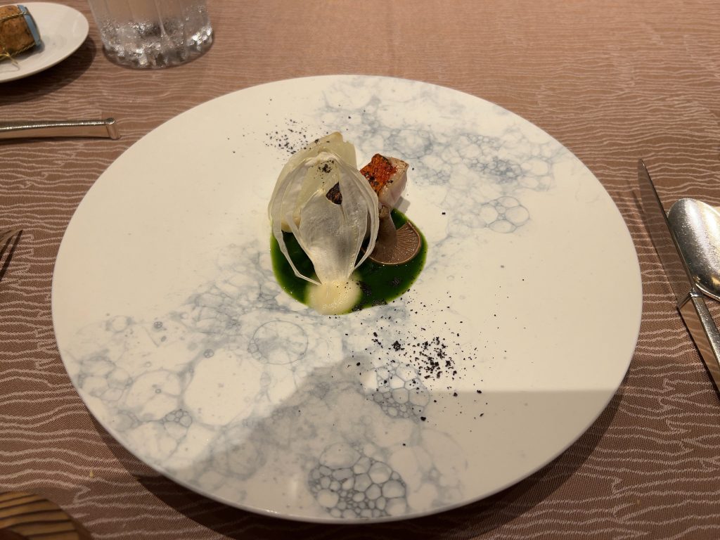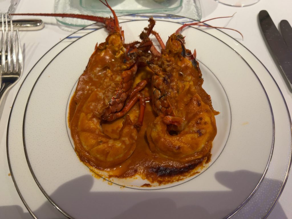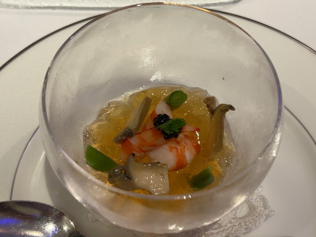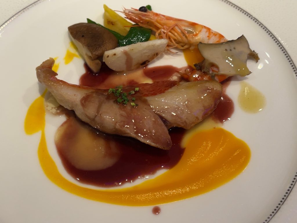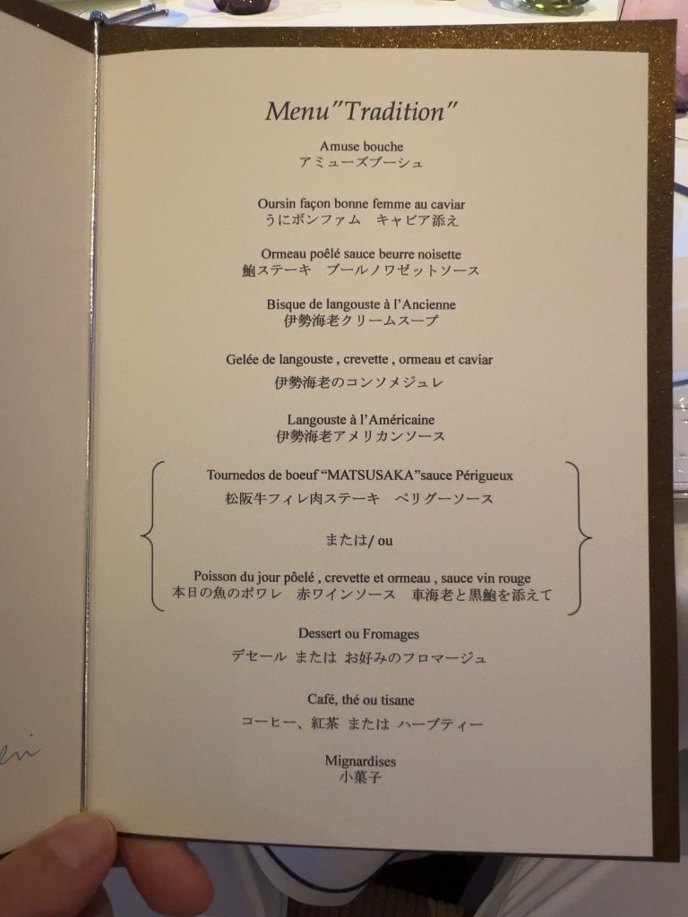 夕食は最上階のレストランでフランス料理を頂きました。プランにトラディションというコースが含まれていて、伊勢海老の料理がメニューに入っています。