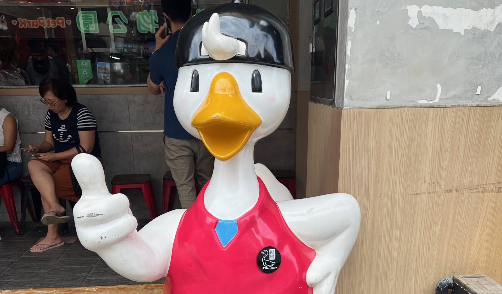 ガチョウ肉の有名店。店先にマスコット?がいます。