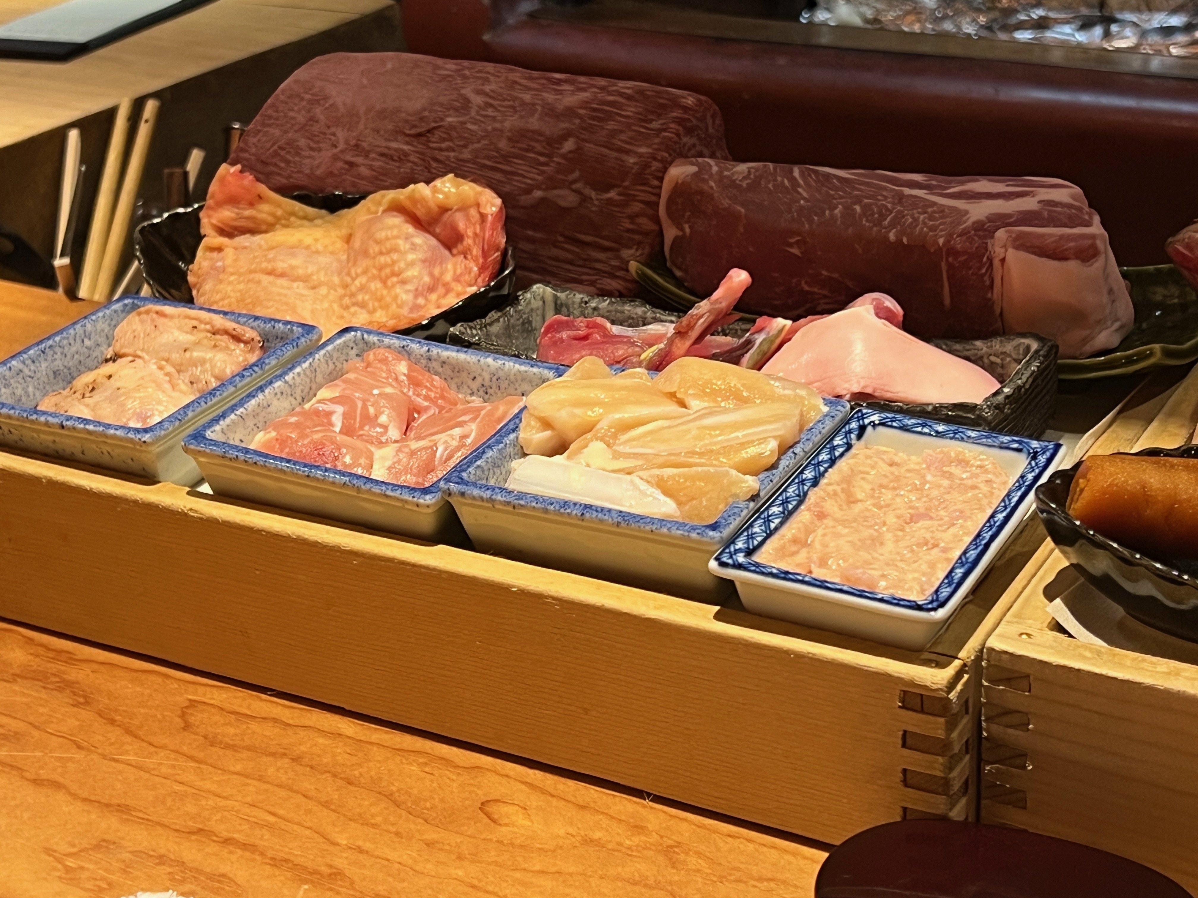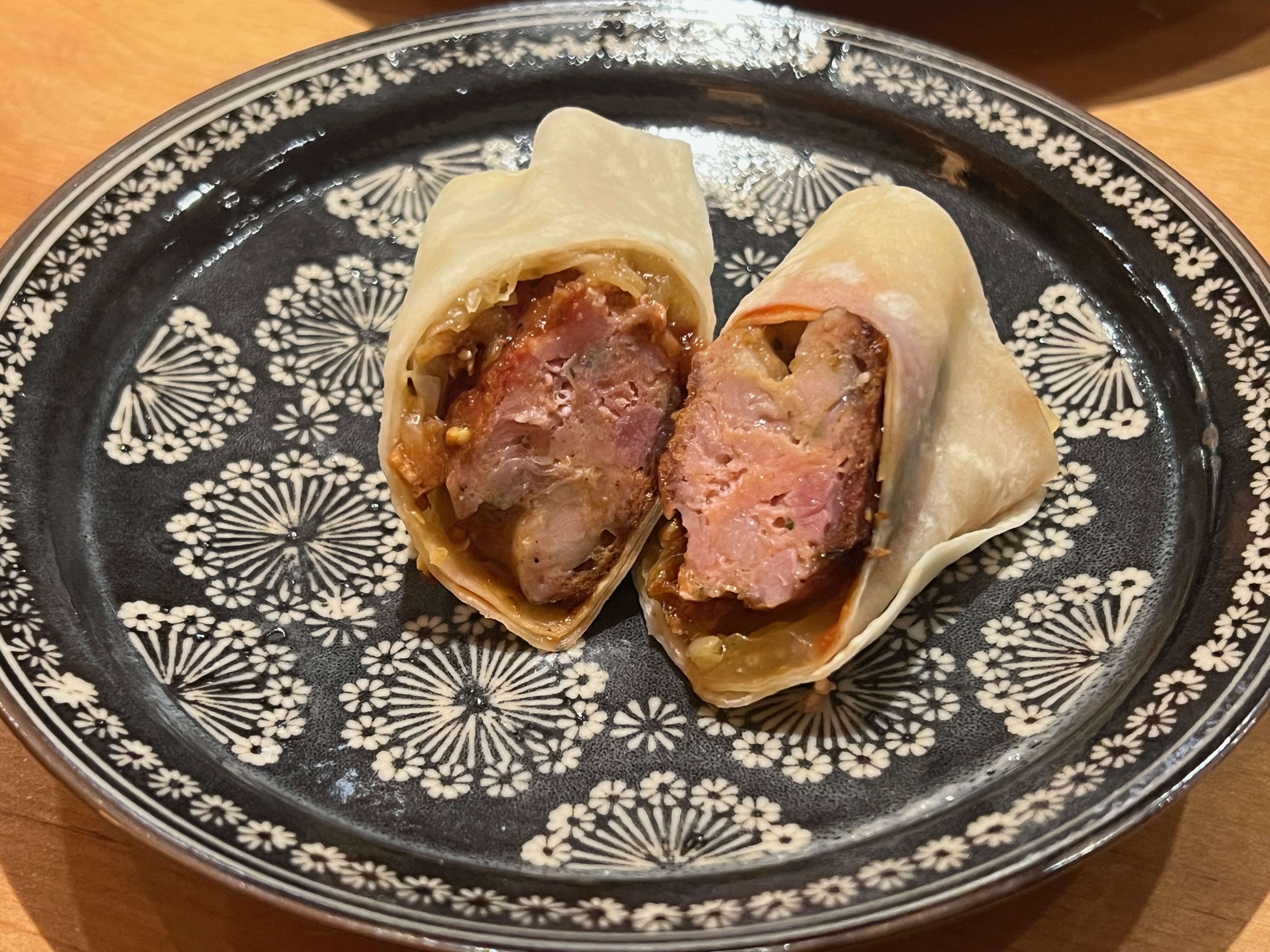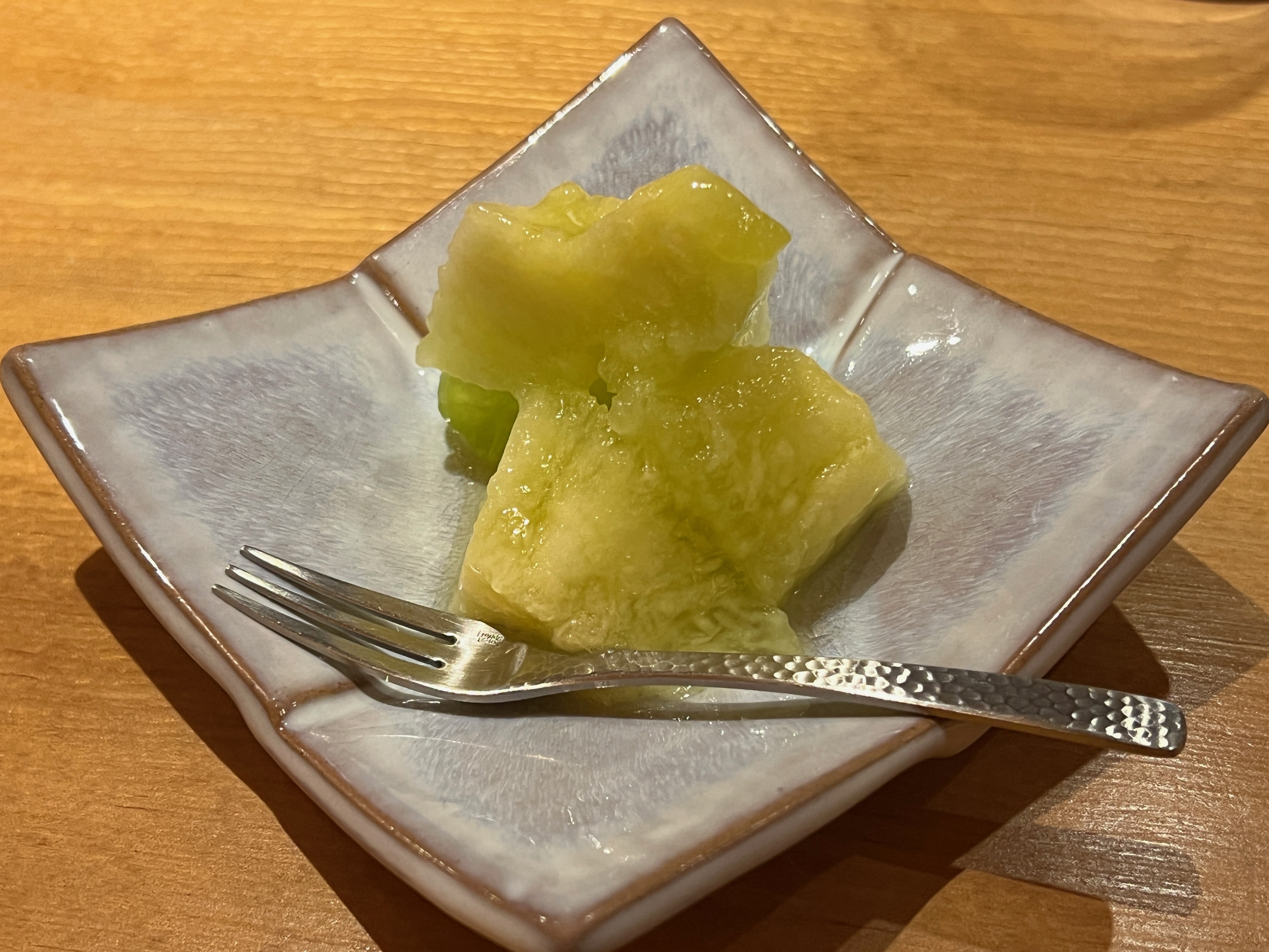 お作りから始まってカラスミ餅や季節の食材を使って、いつものように自分好みに調理していただきました。この季節は大好きな海老芋をどこでも頼んでしまいます。豚肉はカツに、鶏肉は焼きと唐揚げでいただきました。デザートにはとってもあまいメロンを出していただきました。