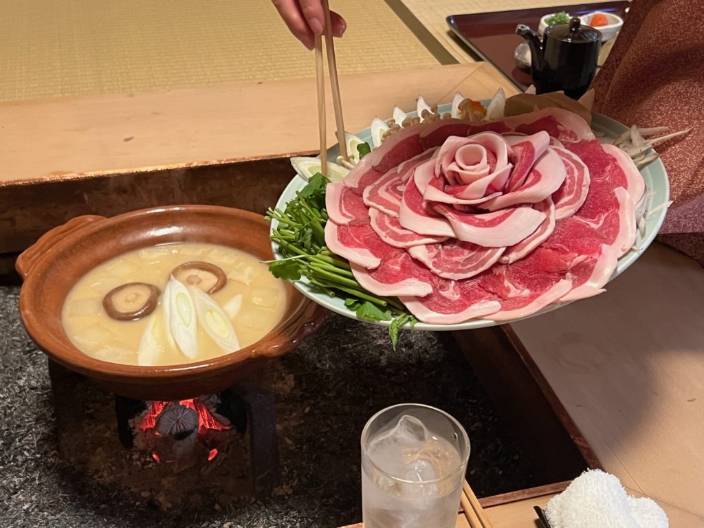 そして鍋が煮立てば明認のぼたん鍋です。奥にはいつもおかわりをいただきます。白味噌仕立てのお鍋がほんとにおいしくて冬の京都ではいつもここで頂くのがお約束になっています。
