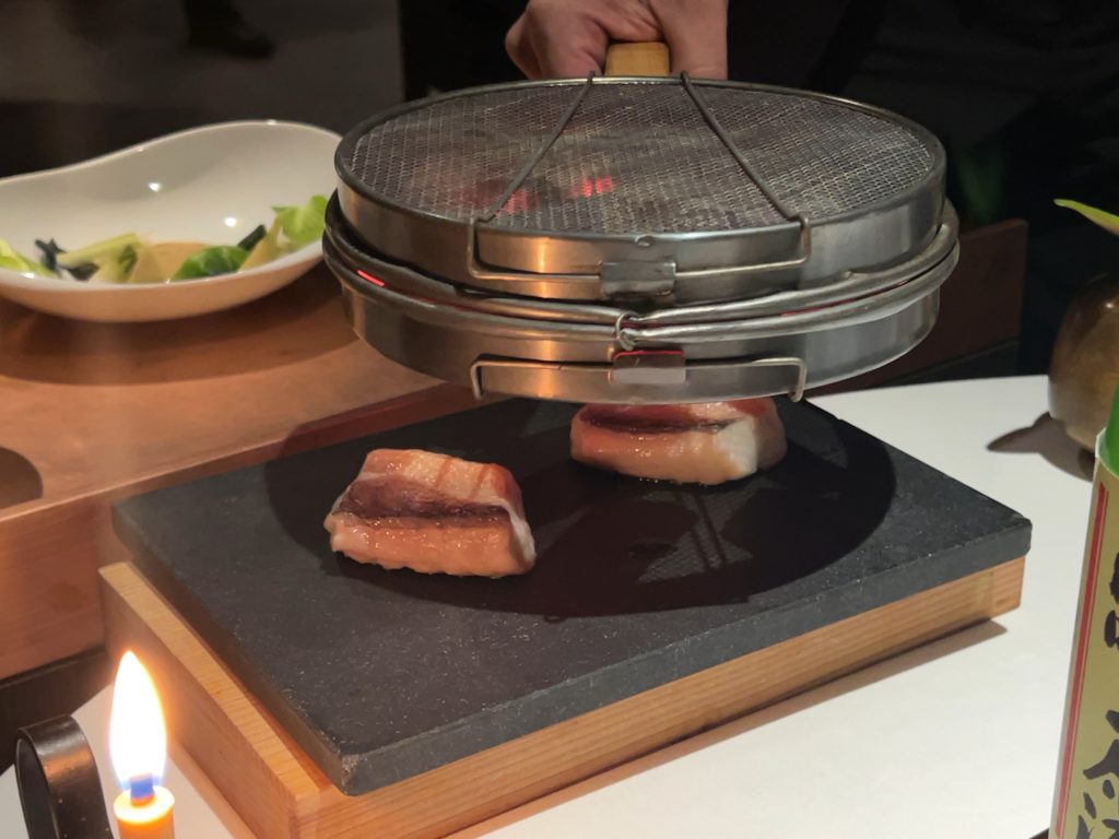 続いて魚料理です。甘鯛になります。テーブルで炭を使って表面をあぶります。