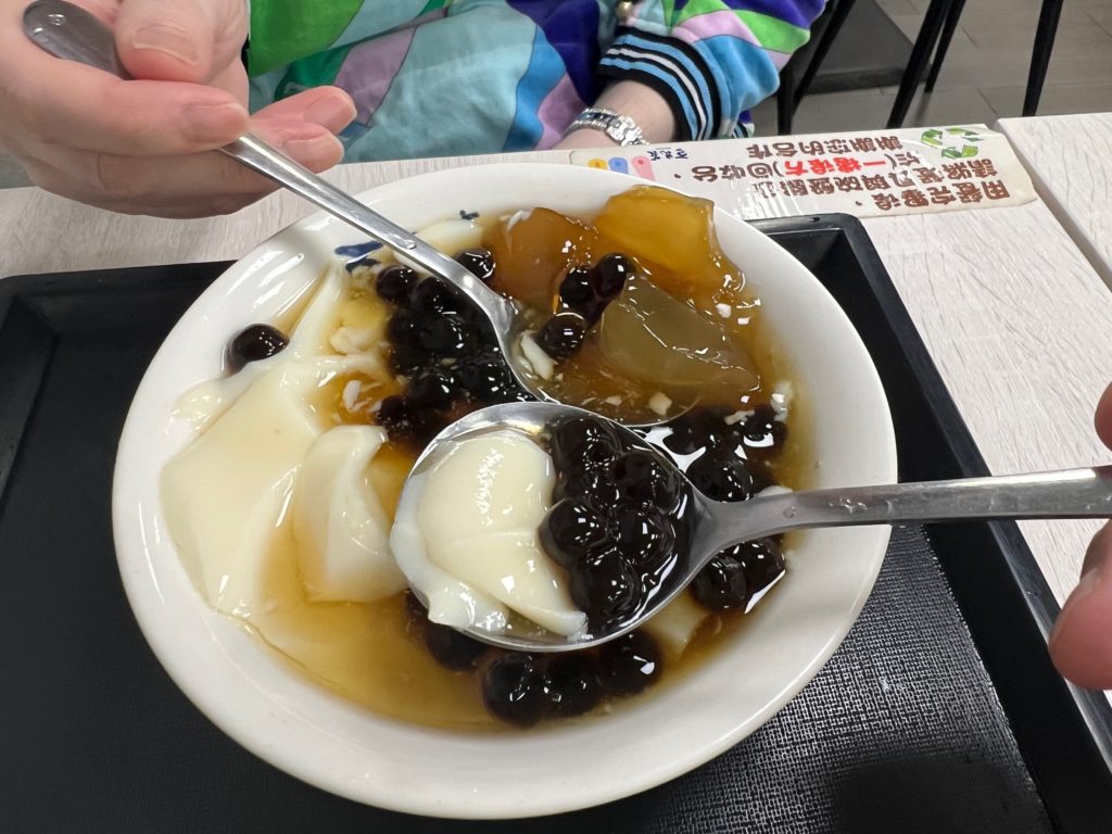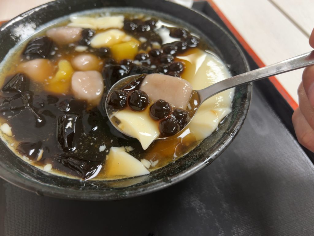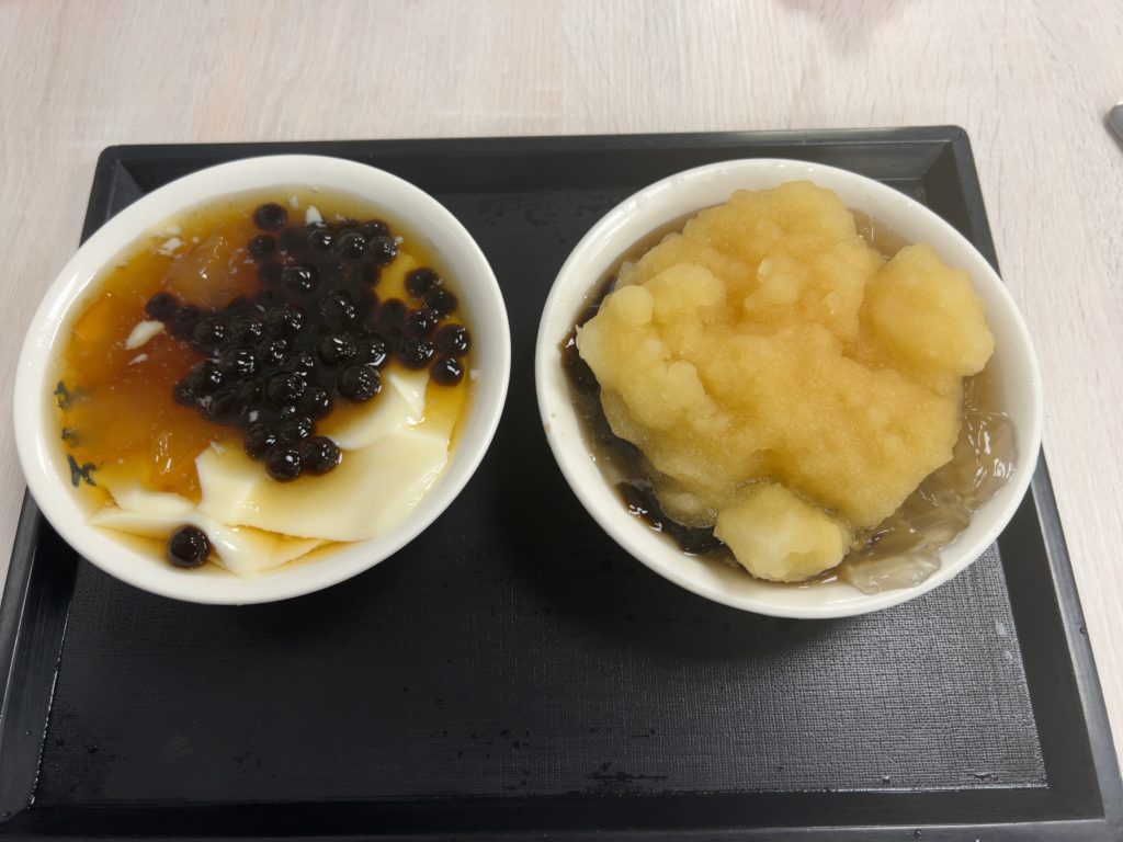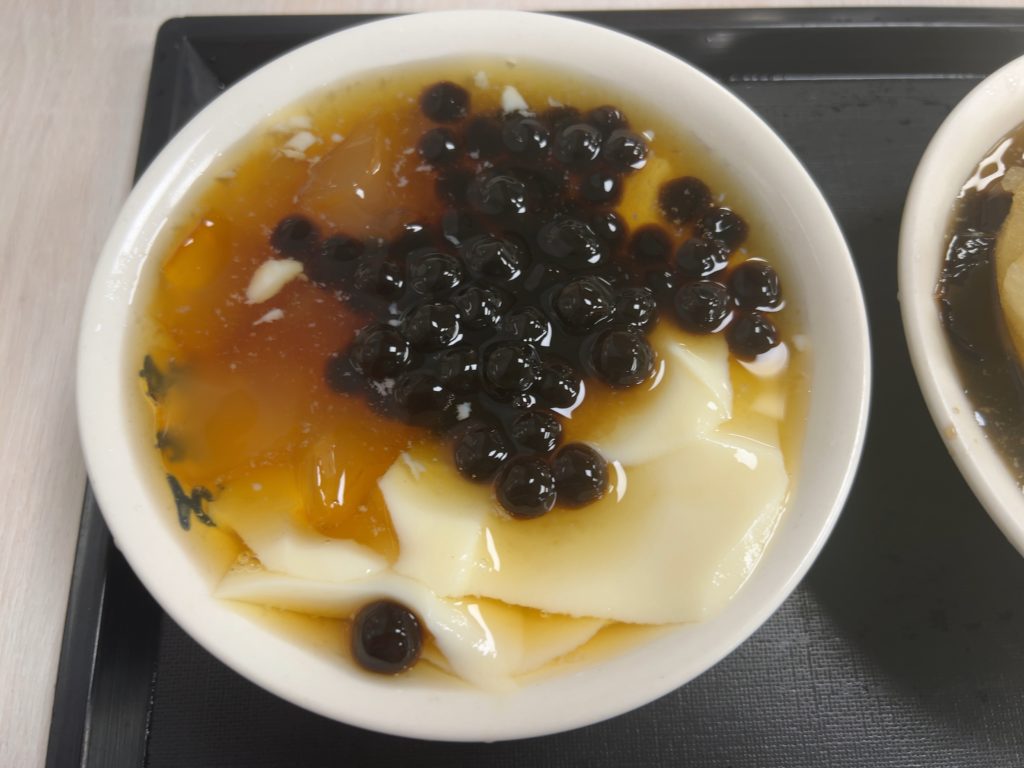 続いて台湾の伝統的スイーツといえば豆花です。すぐ近くの豆花荘へ向かいます。私はタピオカと葛ゼリーの豆花と檸檬愛玉を、ツレはタピオカ、タロ芋団子と仙草ゼリーの豆花を注文。秒速で出てくるのがすごいです。