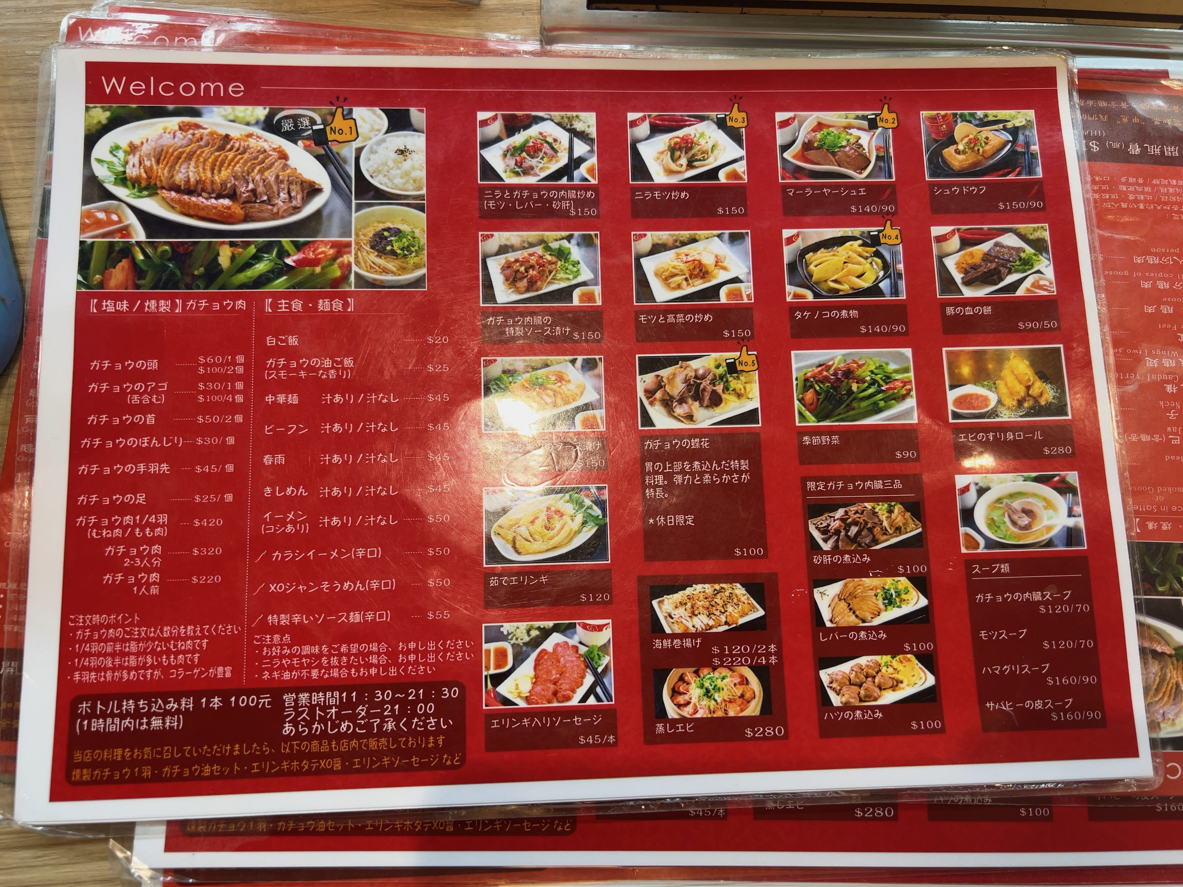 待っている間にメニュー(菜単)を見てまちますが、左側上段の鵝肉類のところがメインになります。前半段が胸肉、後半段がもも肉です。どちらかでしたら2〜4人用で注文しても2人で食べ切れる量と思います。男性2人なら前半段、後半段それぞれ注文しても大丈夫ではないかと思います。