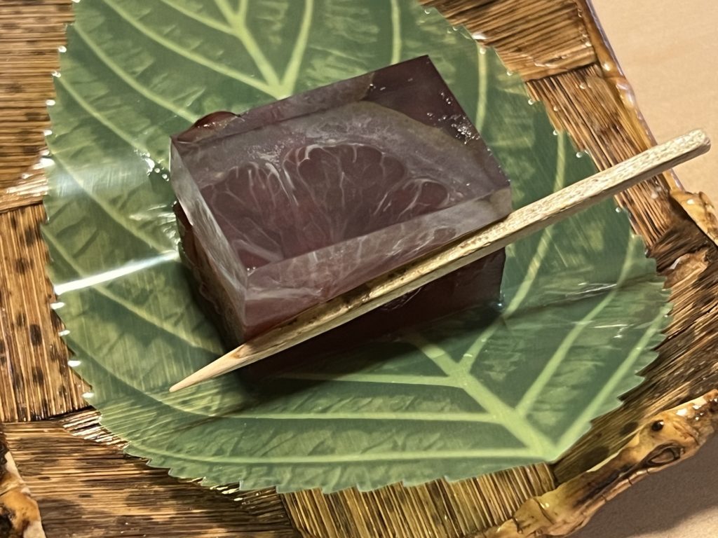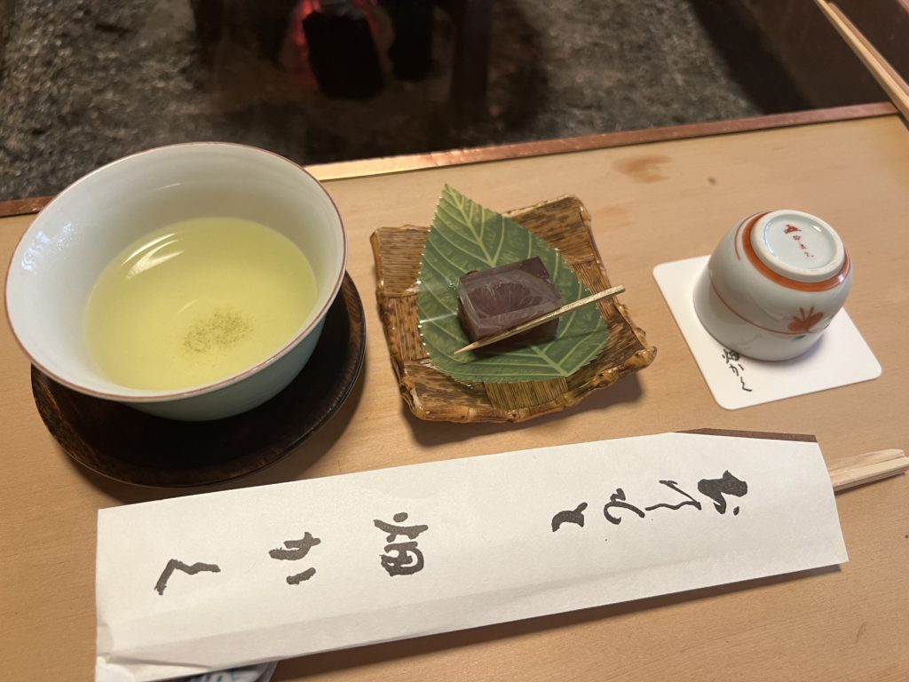 最初にお茶とレモン羊羹がでます。この羊羹、とっても美味しいんですよ。これのお土産があるとよいのですが。