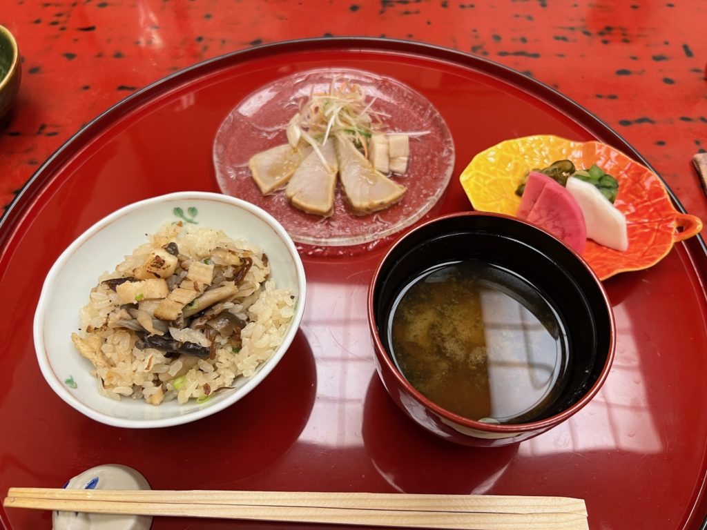 お食事は、ふつうのご飯を炊き込みご飯からいただけます。またお夜食におにぎりを頂くこともできます(当時)。