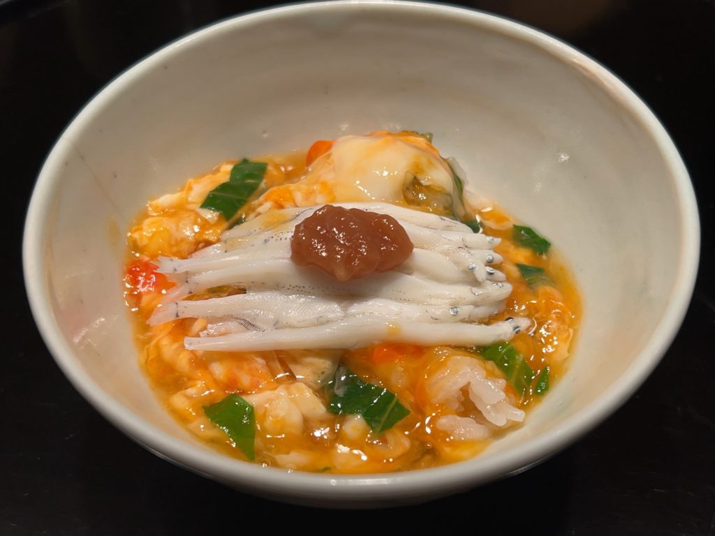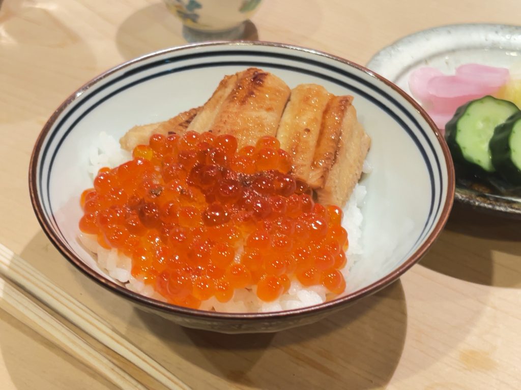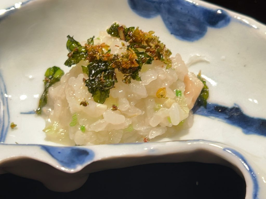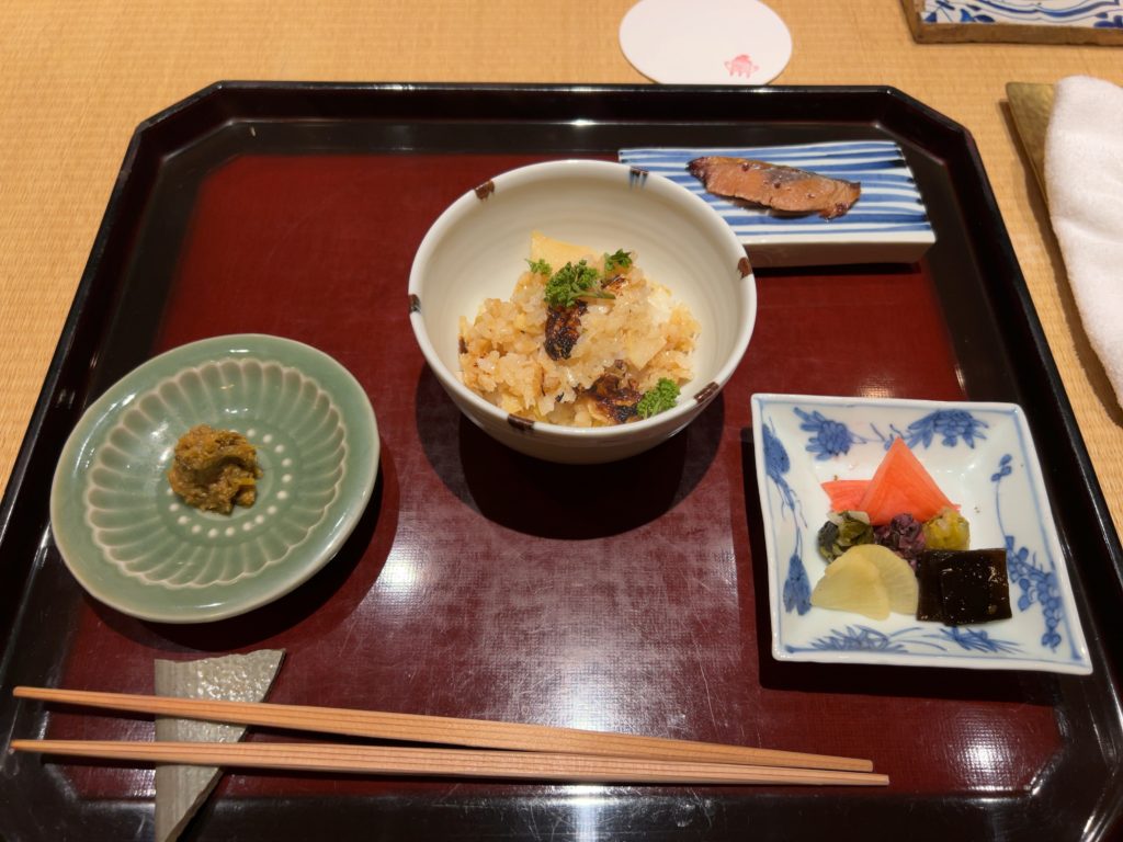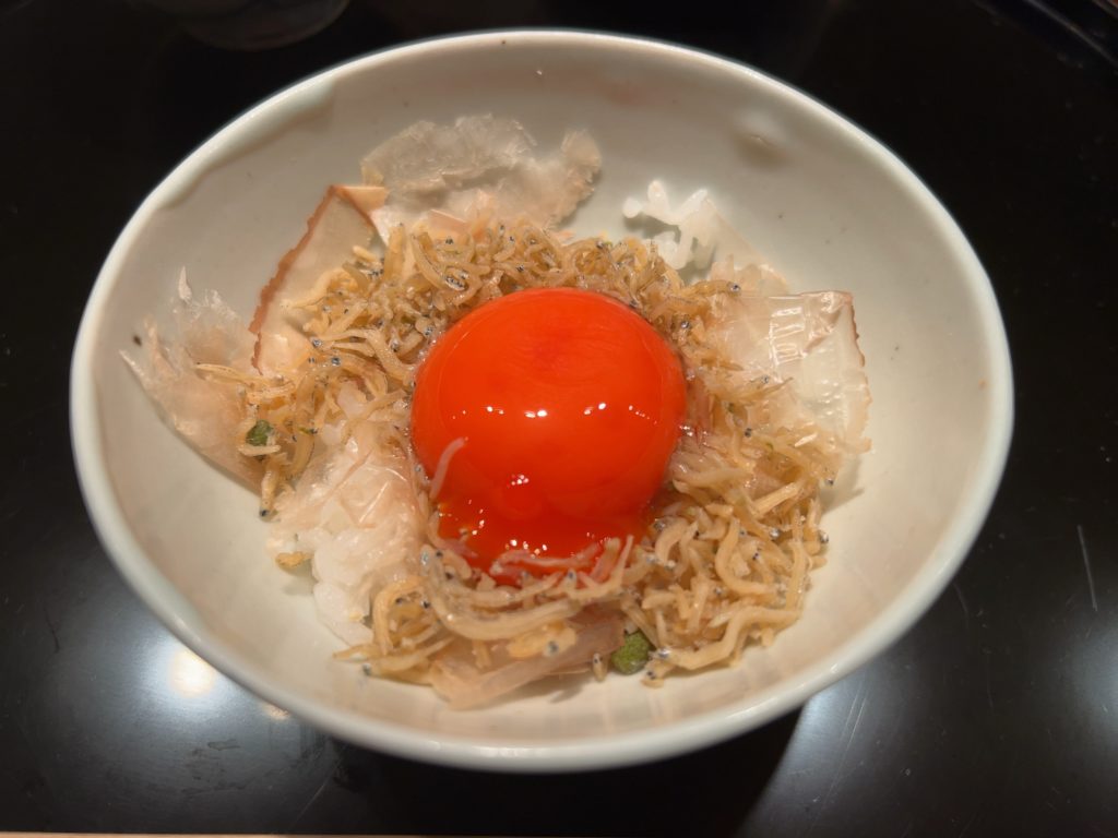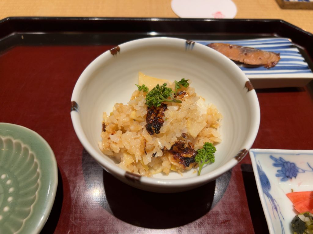 〆のご飯はせいろで蒸した飯蒸しなのですが、今日はなくなってしまったとのことで、ごはんにのせて頂きました。