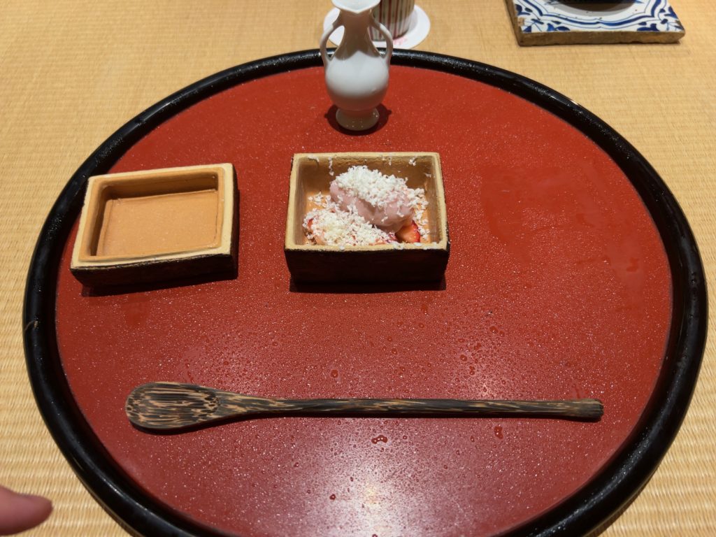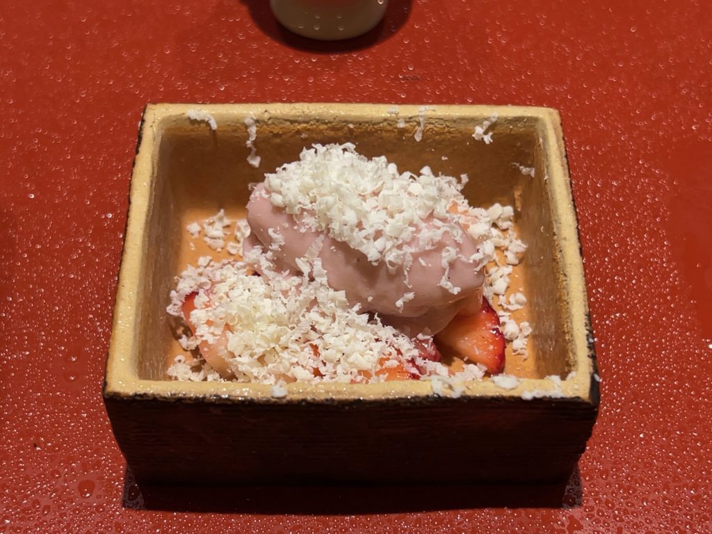 デザートは2品。いちごを使ったデザートでと最中の皮で挟んで頂くお菓子です。