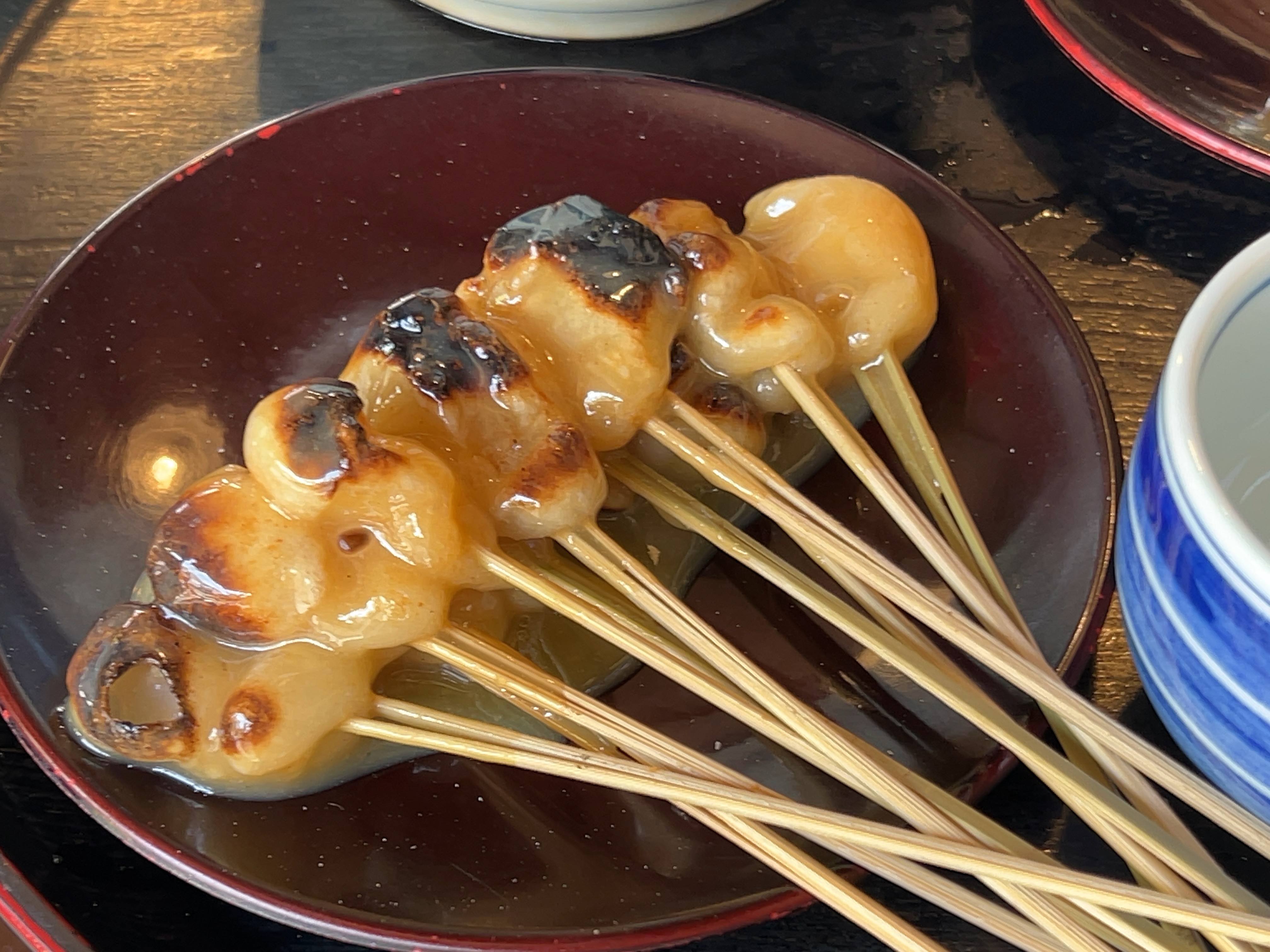 白味噌仕立ての甘いたれが炙ったお餅とよくあっていて、とても美味しいです。あっというまに10本頂きました。